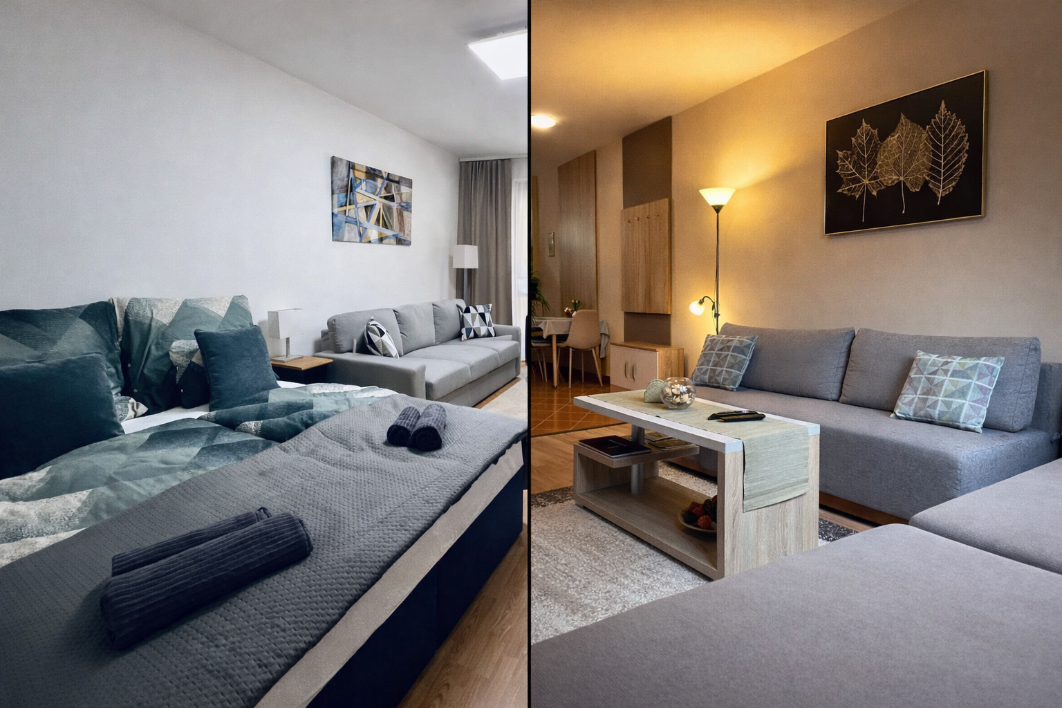 Az apartmanokba kényelmes, teljes értékű dupla kanapékat helyeztünk el. Az egyik 2 db egyszemélyes heverővel, a másik egy 160 cm széles kontinentális ággyal (francia ágy) rendelkezik.